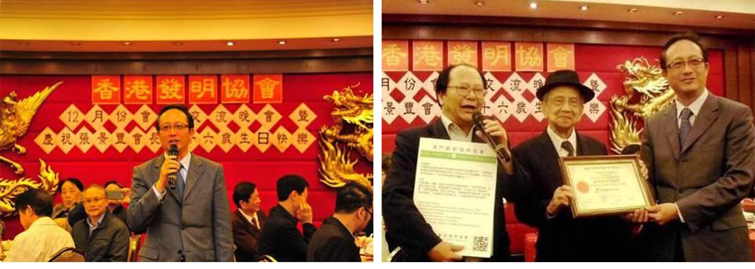 2012年12月9日,本会会长黎栢強、原副会长崔德明及原理事长陈荣应邀出席了香港发明协会会员作品交流晚会暨张景丰会长九十六岁大寿晚宴(左图)