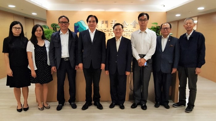 余华荣、王景东、黎栢强、陈荣、冯为钊等在科访澳门基金会后与行政委员会委员黎振强、资助处处长梁衍端、教科文中心处长梁雅桃合影