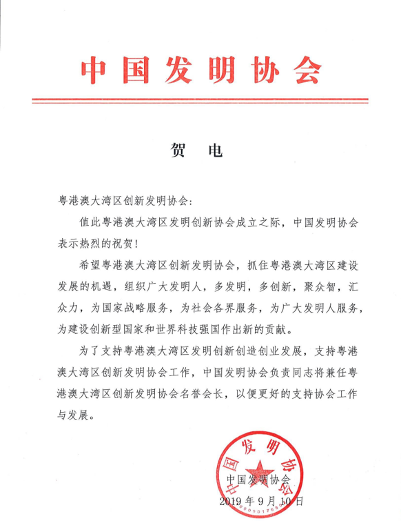 中国发明协会发来贺电,祝贺粤港澳大湾区创新发明协会正式成立,希望粤港澳大湾区创新发明协会,抓住粤港澳大湾区建设发展的机遇,为建设创新型国家和世界科技强国作出新的贡献。为了支持粤港澳大湾区创新发明协会工作,该协会理事会党委书记、 常务副理事长兼秘书长余荣华将担任名誉会长。