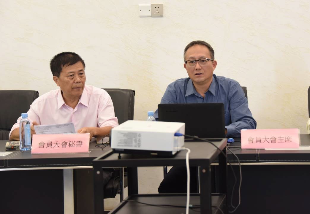 黎栢强(右)、张社兴分别获推选为会员大会主席及秘书,正在主持会议中。