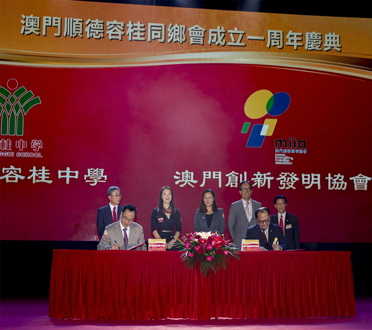 2016年11月5日,为了进一步贯彻落实科教兴国战略方针,推动发明创造活动深入开展,培养新时期科技创新人才,提高顺澳两地科技创新能力,就学生交流活动事宜,依平等互惠原则,本会与佛山市顺德区容桂中学,经友好协商,双方加强发明创新交流合作协定在澳门顺德容桂同乡会成立一周年庆典上签署了合作协议。