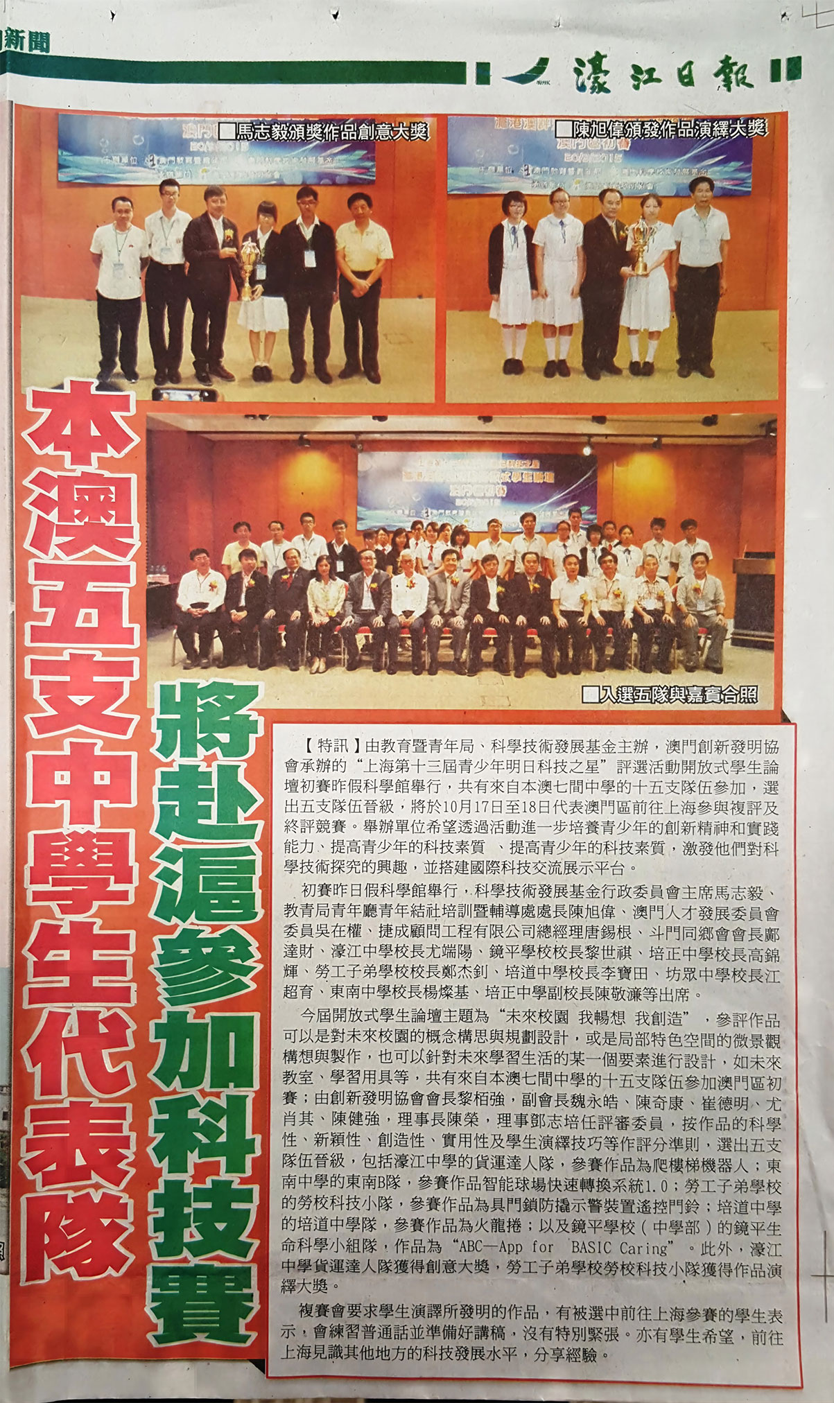 在9月19日由教青局、科技发展基金主办,本会承办的“第十三届青少年明日科技之星评选活动”澳门区初赛中评选出的濠江、镜平、劳校、培道及东南等中学所组成的五支队伍,于10月16日,在以本会会长黎栢强为团长、理事长陈荣为副团长的带领下,一行22人从澳门机场出发,远赴上海与来自沪、港的13支队伍,进行复评和终评竞赛。澳门科学馆馆长邵汉彬,本会黎栢强及陈荣应邀担任评委和裁判。本次参赛获教青局资助全部经费。