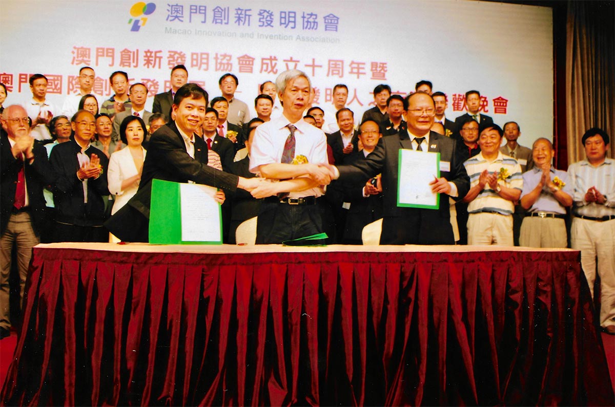 2014年6月29日,(左起) 香港发明协会副会长刘世苍、广东省发明协会副理事长兼秘书长刘庆茂、澳门创新发明协会理事长陈荣联合签署关于加强粤港澳发明创新交流合作协定后互相握手道贺