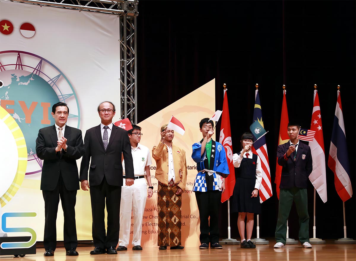 台湾(原总统)马英九(左1)与台湾教育部(常务次长)林腾蛟(左2)各参赛代表(右2为澳门学生代表汤巧莹)合影