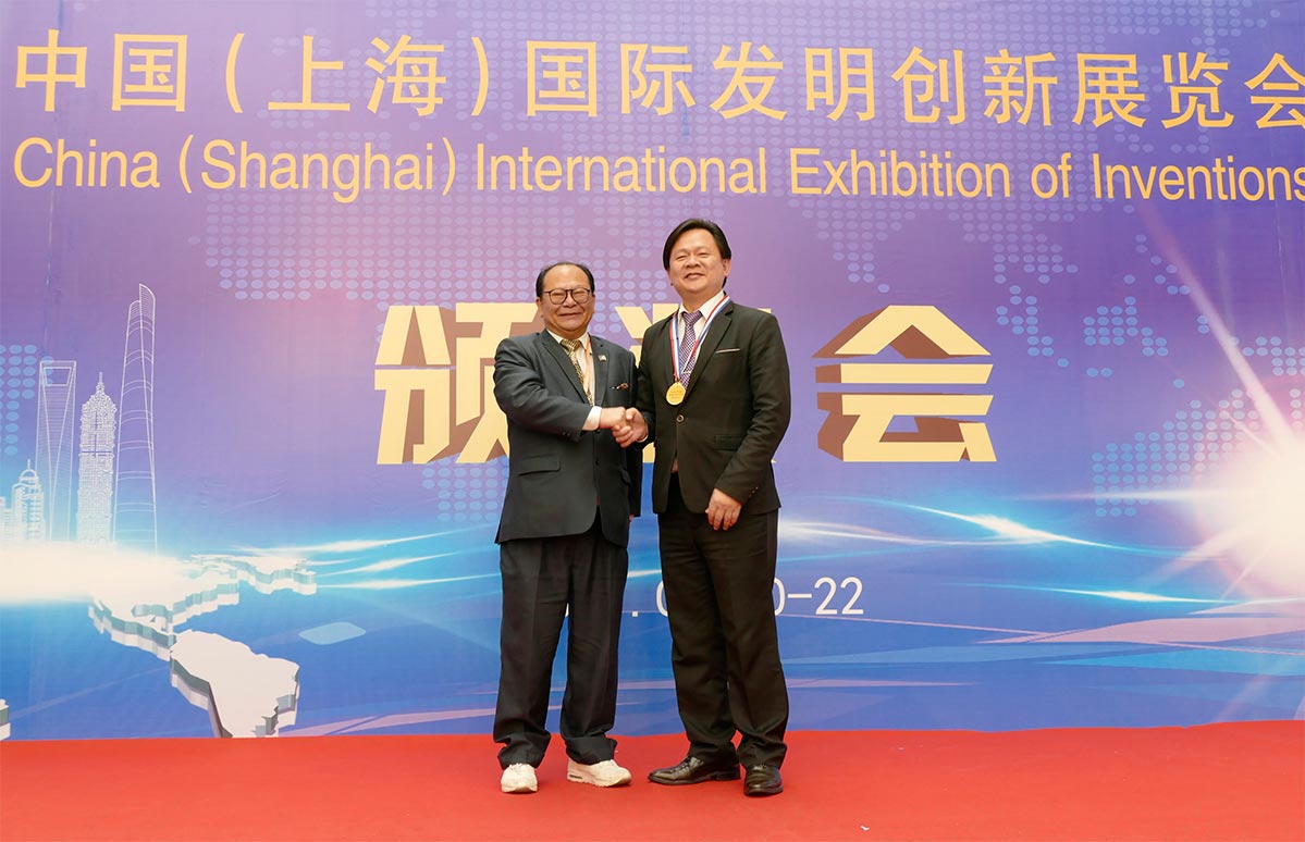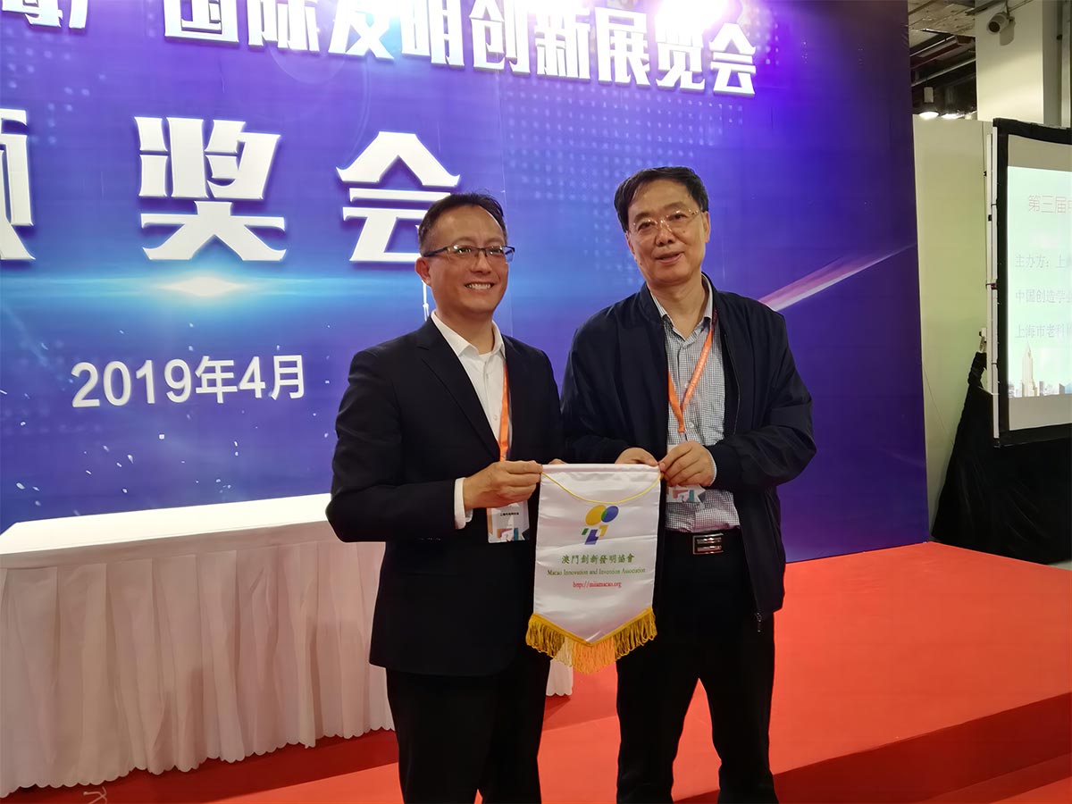 会长黎栢强向上海发明协会会长于建国致送了纪念品