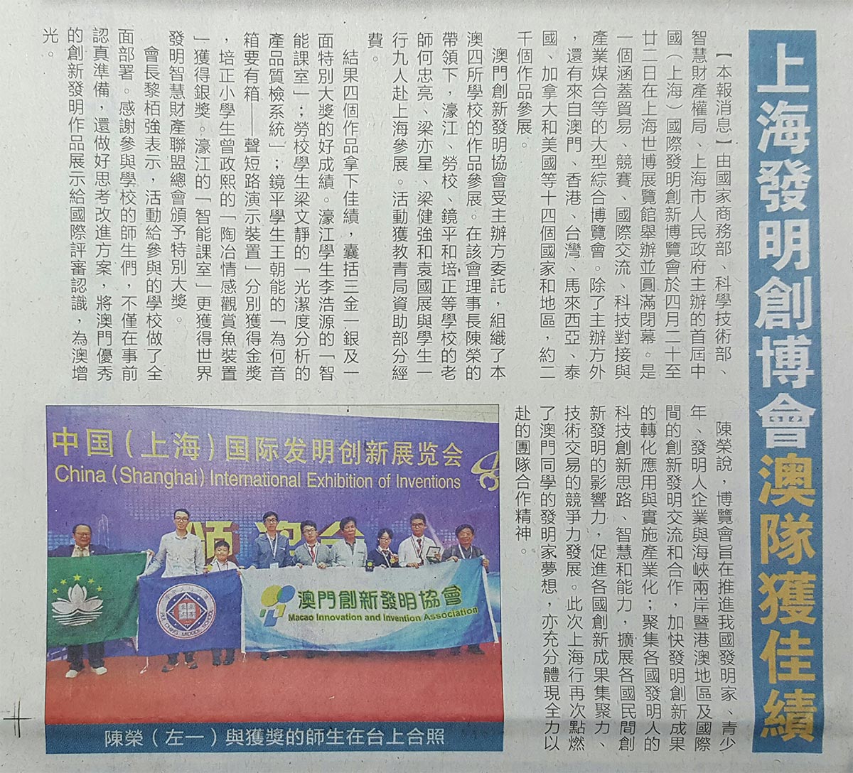澳门队成员获奖后在舞台合影