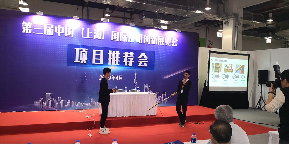 濠江中学林展扬同学(右边)在项目推荐会介绍其作品情况