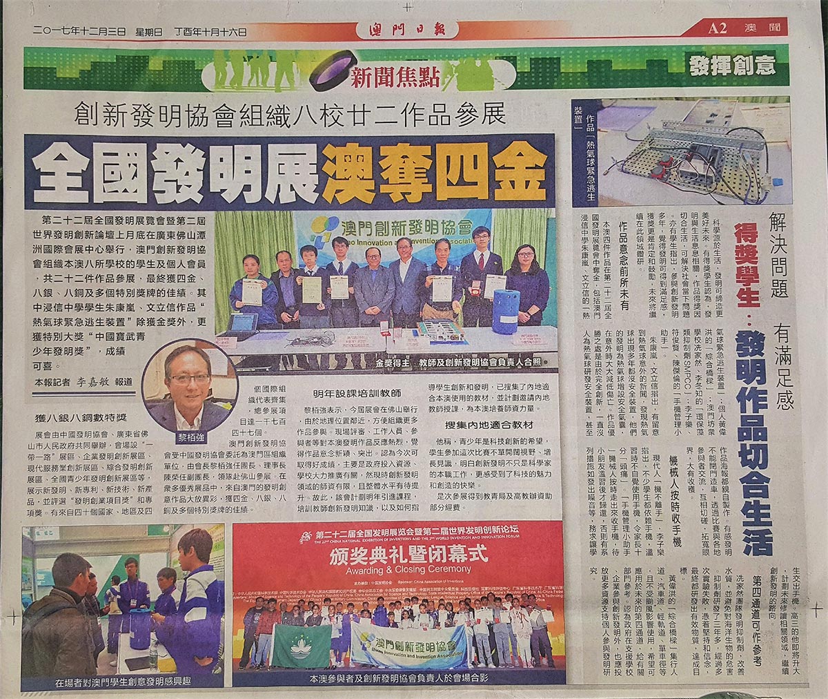 在众多优秀的展品中,来自澳门的发明创意作品同样大放异彩,共获得四金八银八铜与多个特别奖牌,当中澳门浸信中学朱康岚、文立信的作品 “热气球紧急逃生装置”除获得金奖外,更获得全场只有二十个的特别大奖 “中国宝武青少年发明奖”,可喜可贺!本次参展得到教青局及高教办资助部份经费。