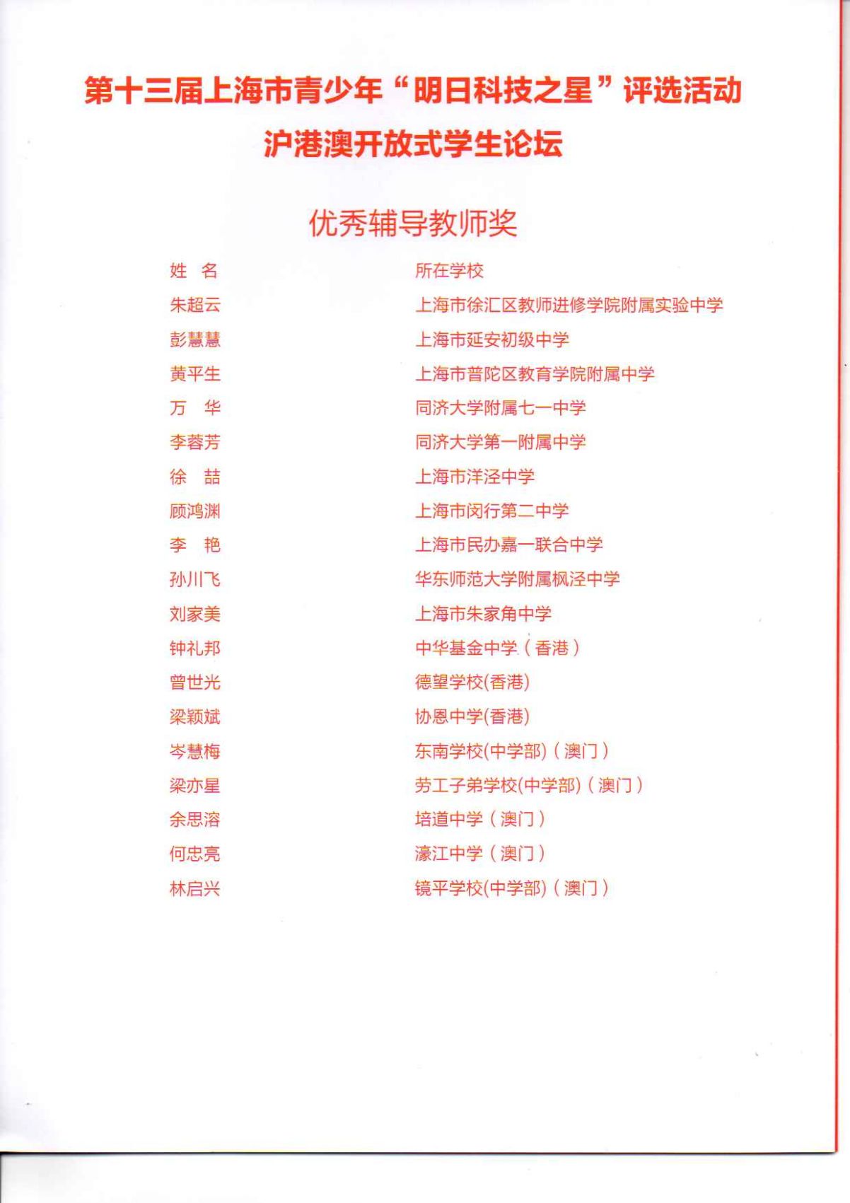 第十三届上海市青少年"明日科技之星"评选活动 沪港澳开放式学生论坛