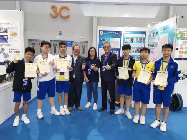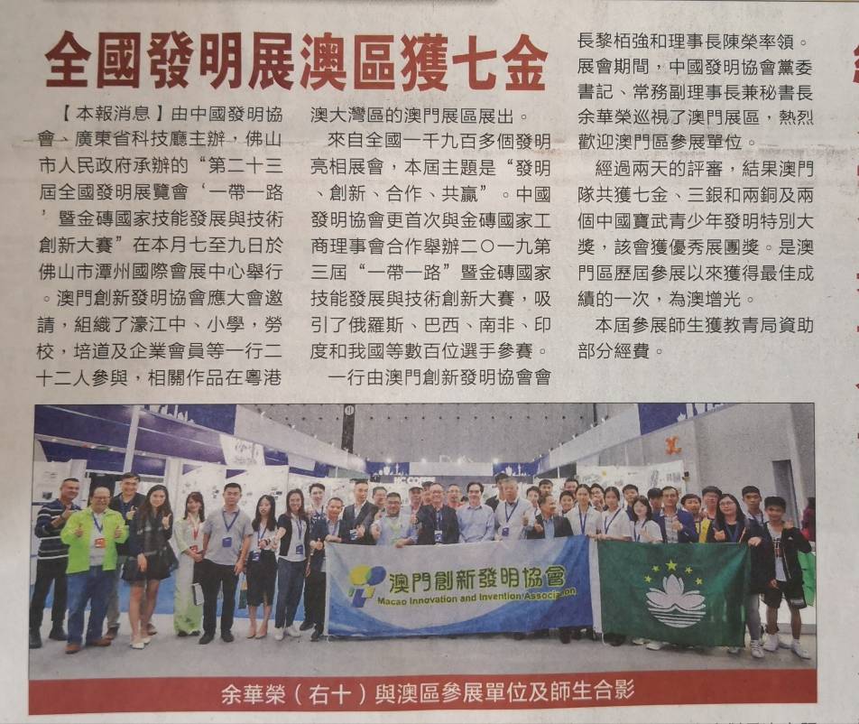 经过两天的评审,结果澳门队共获七金、三银和两铜及两个中国宝武青少年发明特别大奖,该会获优秀展团奖。是澳门区历届参展以来获得最佳成绩的一次,为澳增光。 濠江中学共获三金一银一铜,当中彭琳的“智慧城市灯柱网定位辅助视障人士语音护航智慧导盲装置”、沈书屹的“传统中药百子柜智能化低成本改造”、曾梓骏的“VR重构18世纪澳门圣保禄学院一带景观的历史学习体验软件”均获得金奖;濠江小学获一银;培道获两金一银一铜,当中姜河清、黄振宇的“基于空气压缩环保水樽回收箱”及李健彬、林俊帆的自动巡航螺丝清理小助手”均获金奖;劳校黄嘉玮、郭晋文的“一种基于电磁感应定律的电机转子绕组匝间短路故障检测装置”获金奖。
