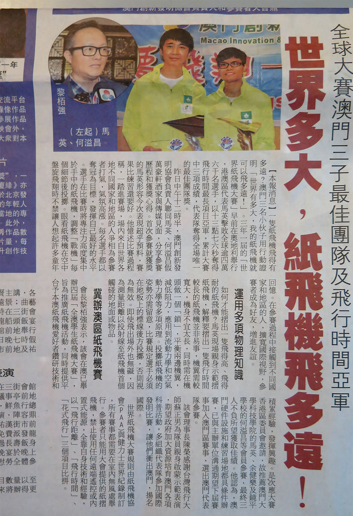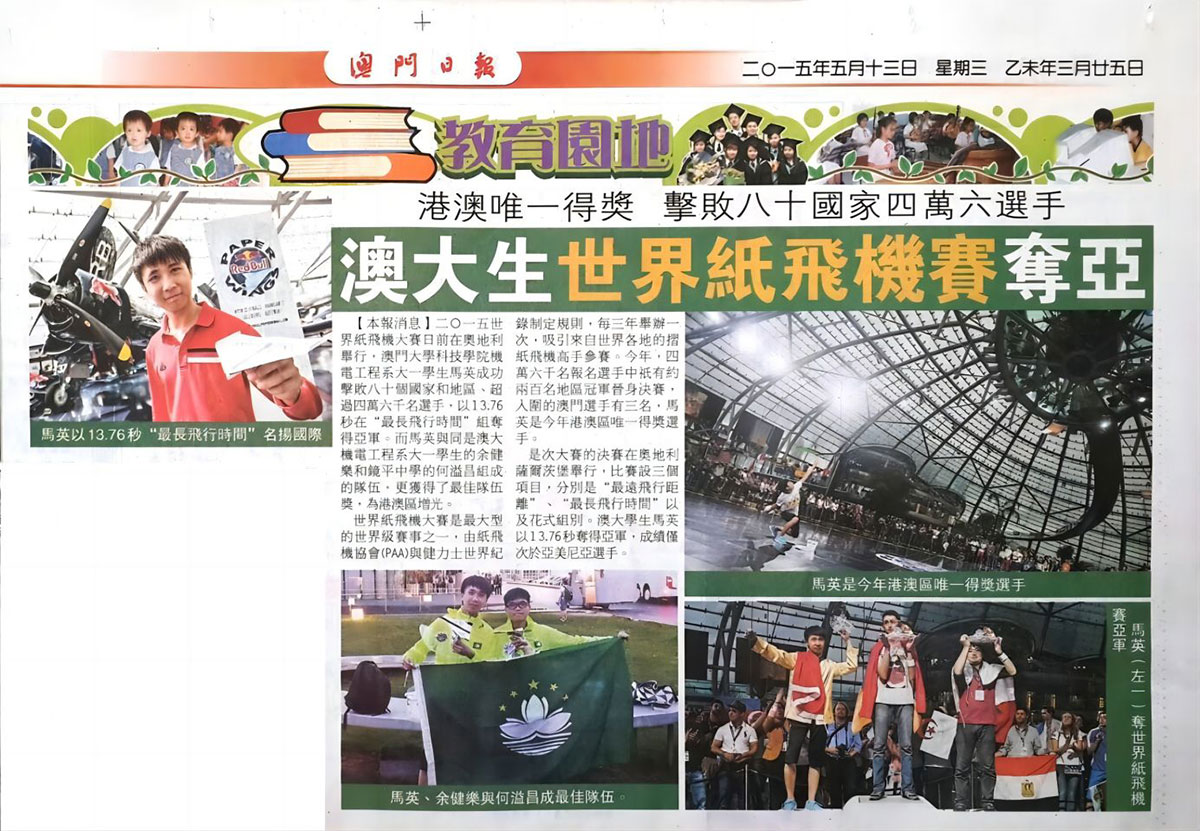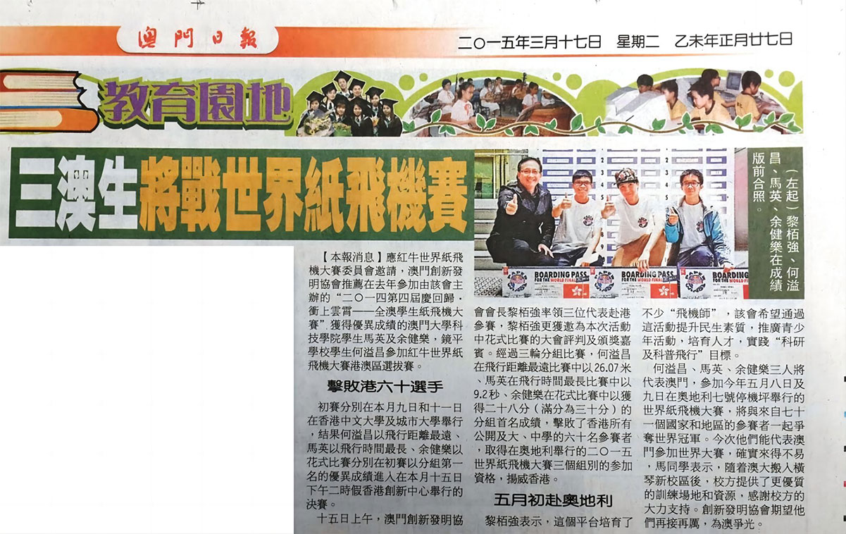 当年选派出三位成绩优异的澳门学生在香港经历三场资格预选赛,脱颖而出进入决赛,他们分别荣获“飞行距离最远”、 “飞行时间最长”及 “花式飞行”三个项目的第一名,组成了一支港澳区代表队,在5月8及9日假奥地利举行的2015红牛世界纸飞机大赛中再下一城,勇夺全场唯一的最佳团队奖,并荣获世界飞行时间最长第二名,实至名归,为澳增光。马英更为此荣获澳门特区政府授予2015年功绩奖状,可喜可贺!