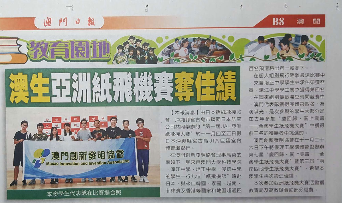 再接再厉,喜讯频传,澳门代表队在2017 年 11 月 4 日,又争取参加由日本折纸飞机协会、冲绳县宫古岛市联同日本航空公司共同举办的“第一届JAL亚洲纸飞机大赛”的资格,在理事马英的率领下,由澳大科技学院、濠江、培正、浸信等团体会员的9名学生组成的澳门代表队与来自日本、韩国、泰国、越南、菲律宾及香港等国家和地区超过四百名选手同场一较高下, 结果培正中学林承佑同学在个人组别飞行距离最远比赛中获得亚军,濠江中学关杰同学获得第四名;又在团体组别最长滞空时间竞赛中,澳门代表队获得团体赛第四名,成绩来之不易,为澳门学界争气,为澳增光!