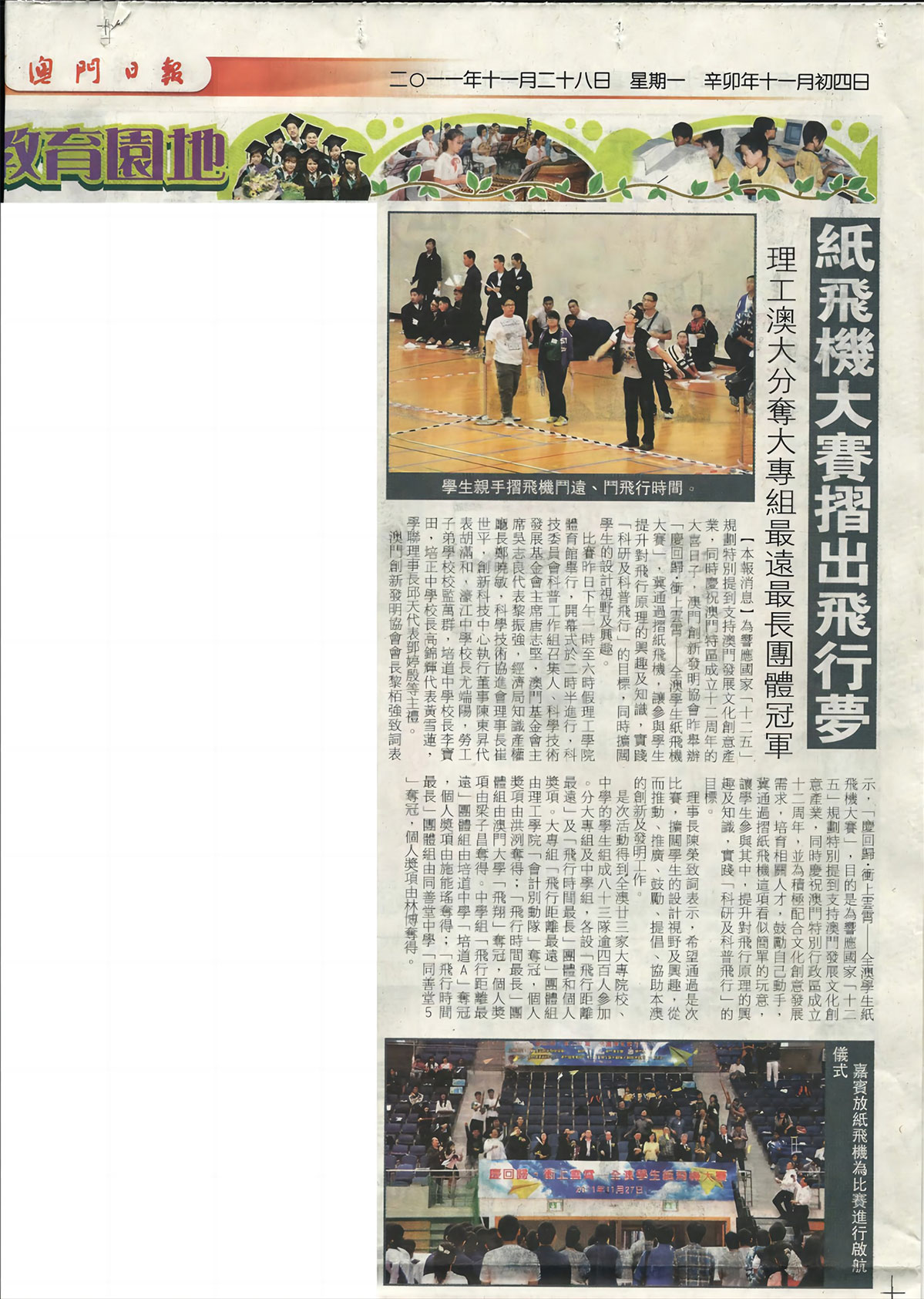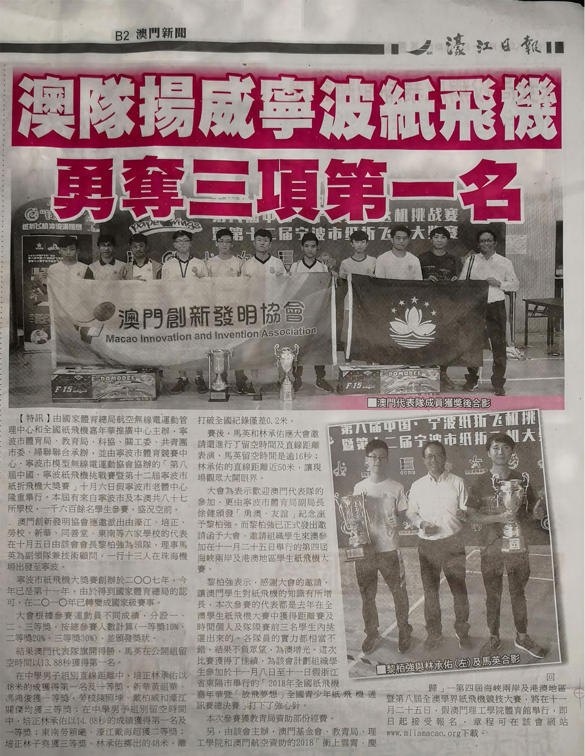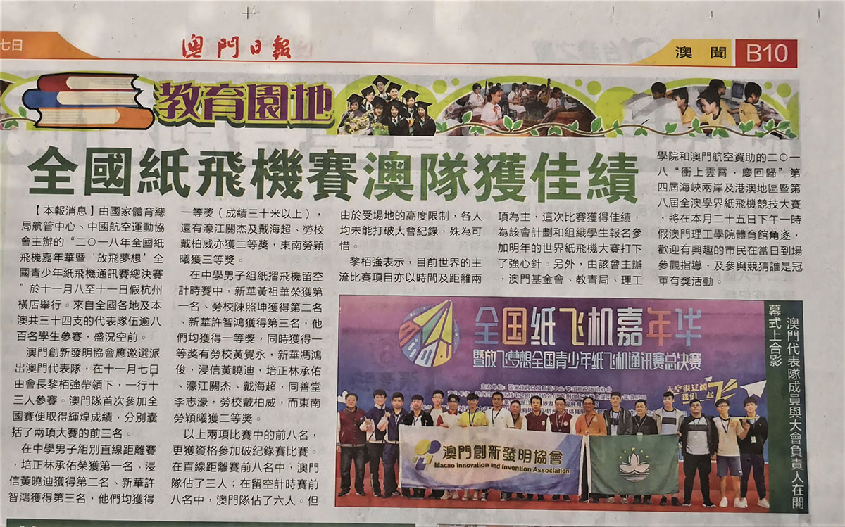 澳门代表队气势如虹,继上月于宁波纸飞机大赛获得佳绩后,更上一层楼,囊括了直线距离及留空计时两项大赛的前三名。首次在参加全国的掷纸飞机赛事中取得辉煌成绩,令人喜出望外!