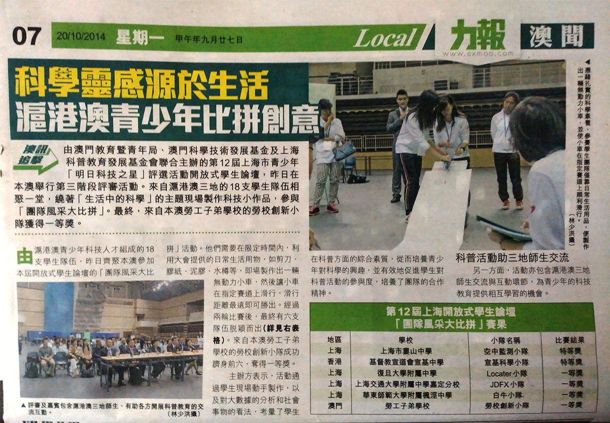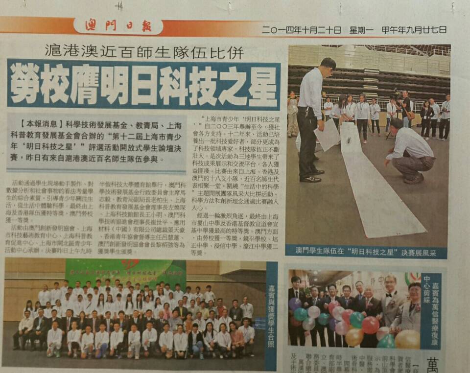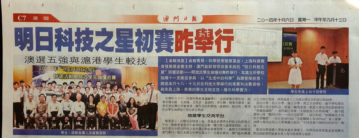 由教育暨青年局、上海科普教育发展基金及科学技术发展基金合办,本会承办的第十二届明日科技之星评选活动之开放式学生论坛初赛分于 2014 年 10 月 5 日于澳门科学馆举行,本澳共有5间学校 32 名学生参赛,而进入复赛和决赛的队伍有 5 队共 15 人。本次参赛获教青局资助全部经费。